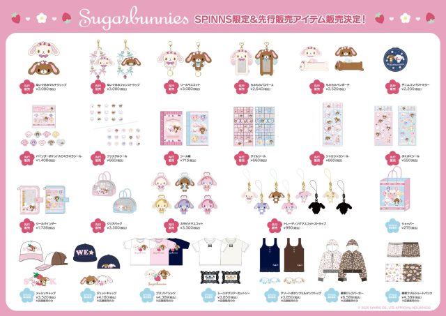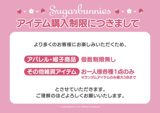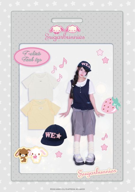 いちごモチーフ、ピンク・水色のパステルカラーなど “甘くてガーリー” な世界観をぎゅっと閉じ込めた雑貨を多数展開。 日常の中で手に取るだけで気分が上がるようなデザインに仕上げました。 さらに、服飾雑貨は(帽子)は、シュガーバニーズファンの幅広い年齢層が 手に取りやすいよう、日常使いしやすいデザインに。一点投入するだけで コーデに可愛さがプラスされます。